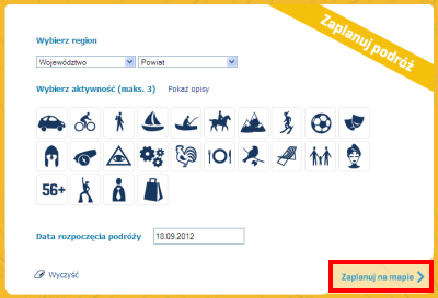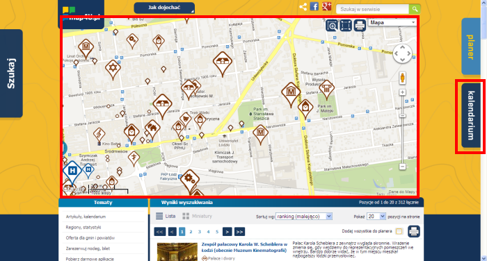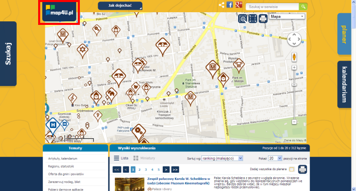 Na stronie mapy dostępne są podstawowe funkcje serwisu: Szukaj na mapie, Wycieczka - Planer i Kalendarium.